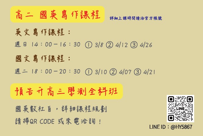高一、高二下課程熱烈報名中,加入LINE官方帳號好友,並傳送訊息,將享有LINE好友專屬學費優惠!!...